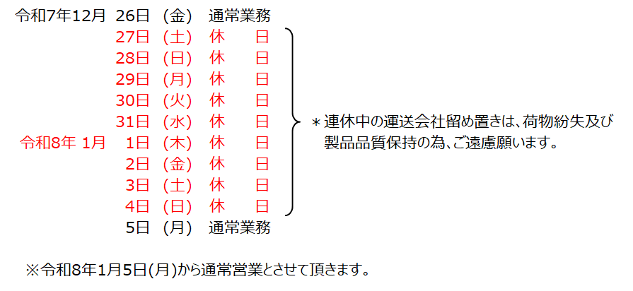 年明けの1/5(金)納入については、連休中の保管管理や製品の品質保持の為出来るだけ避けていただきますようご配慮のほどよろしくお願いします。